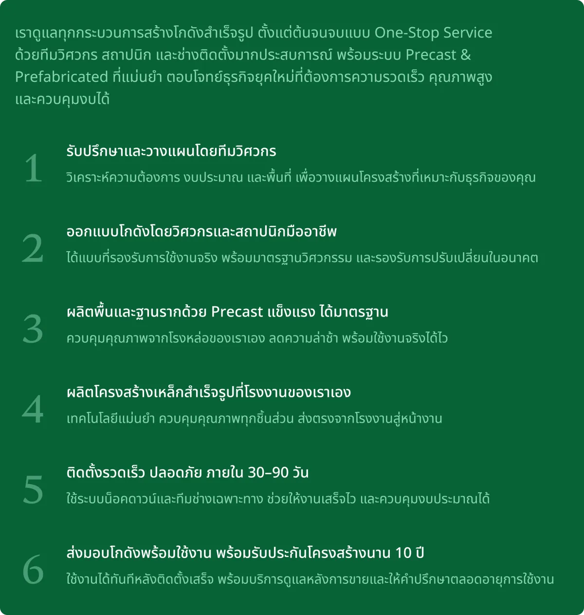 เรามุ่งมั่นเป็นพันธมิตรที่เติบโตไปพร้อมกับลูกค้า ทั้งด้านการก่อสร้างอาคารสำเร็จรูป และการสร้างโอกาสทางธุรกิจในยุคใหม่