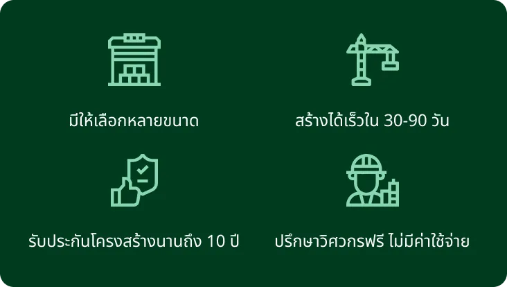 ราคาขึ้นอยู่กับ ขนาด, ความสูง, วัสดุ และฟังก์ชันเพิ่มเติม เช่น ชั้นลอยหรือเครน โดยทั่วไป เริ่มต้นที่ 3,500 – 4,500 บาท/ตร.ม.